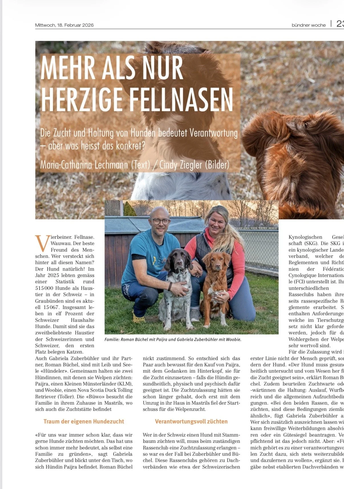 Im Februar hatten wir ein tolles Treffen mit der jungen Journalistin der Bündner Woche zum Thema; verantwortungsvolle Hundezucht. Neben dem Interview haben wir Maria-Catharina Lechmann sogleich zum Dummytraining mitgenommen. So konnte sie sich direkt vor Ort ein Bild machen, was uns ein grosses Anliegen in der Welpenprägung und natürlich darüber hinaus ist: die artgerechte Förderung.